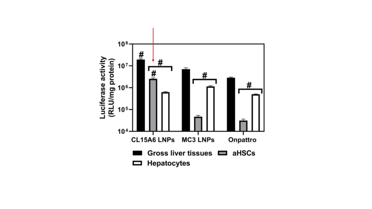figure 2. Comparison of the functional delivery efficiency of FLuc mRNA to gross liver tissues, aHSCs, or hepatocytes 24 h post intravenous administration of the optimized CL15A6 LNPs, MC3 LNPs.